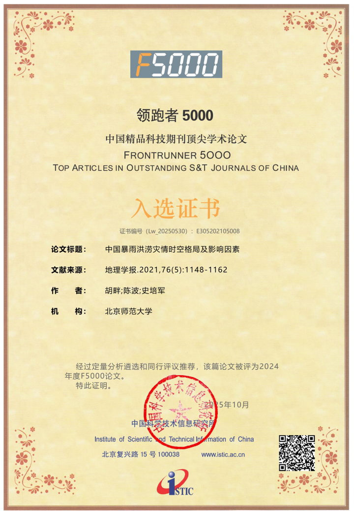 《中国暴雨洪涝灾情时空格局及影响因素》一文由北京师范大学地表过程与资源生态国家重点实验室、环境演变与自然灾害教育部重点实验室、地理科学学部、应急管理部-教育部减灾与应急管理研究院、地理科学学部、青海省人民政府-北京师范大学高原科学与可持续发展研究院共同完成,由胡畔(论文发表时系地理科学学部硕士研究生)、陈波、史培军(通信作者)合作完成,于2021年5月发表在《地理学报》(第76卷第5期 2021年5月,1148-1162页)。