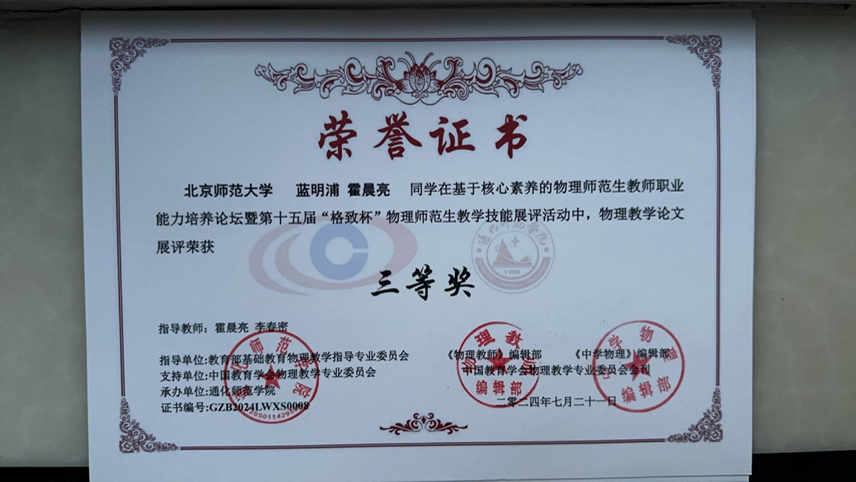 蓝明浦 霍晨亮,物理教学论文三等奖