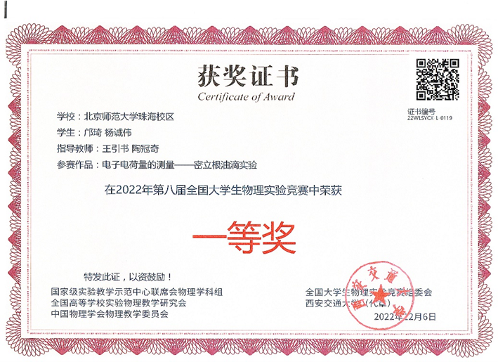 邝琦 杨诚伟,电子电荷量的测量--密立根油滴实验,一等奖。